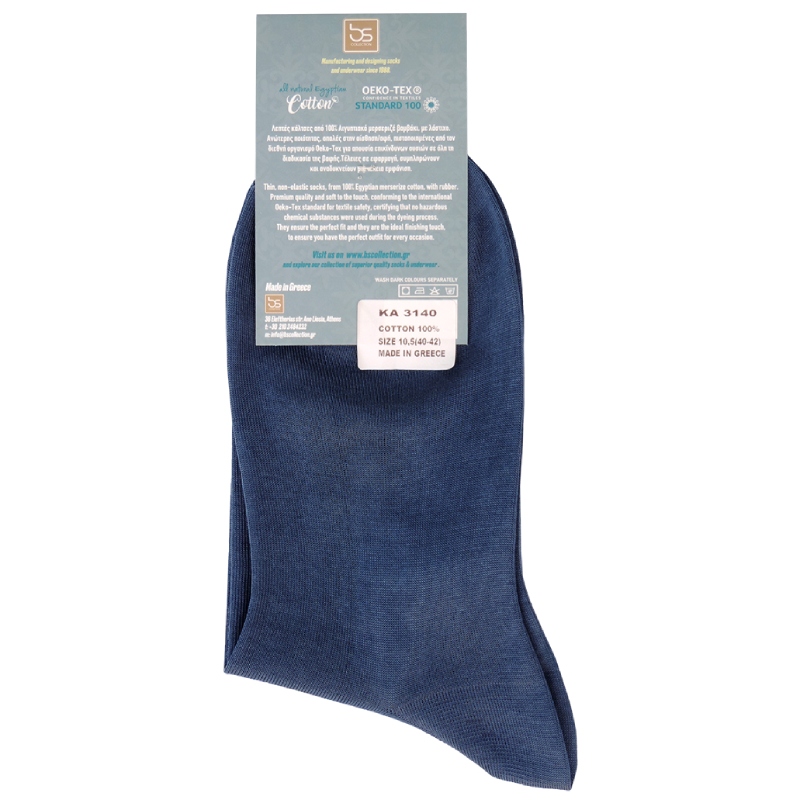 Λεπτές κάλτσες από 100% βαμβάκι, με λάστιχο. Ανώτερης ποιότητας, απαλές στην αίσθηση/αφή, πιστοποιημένες από τον διεθνή οργανισμό Oeko-Tex για απουσία επικίνδυνων ουσιών σε όλη τη διαδικασία της βαφής. Τέλειες σε εφαρμογή, συμπληρώνουν και αναδεικνύουν μια τέλεια εμφάνιση. Thin, non-elastic socks, from 100% merserize cotton, with rubber. Premium guality and soft to the touch, conforming to the internasional Oeko-Tex standard for textile safety, certifying that no hazardous chemical substances were used during the dyeing process. They ensure the perfect fit and they are the ideal finishing touch, to ensure you have the perfect outfit for every occasion.