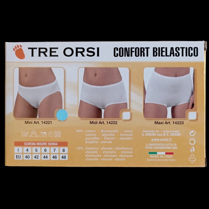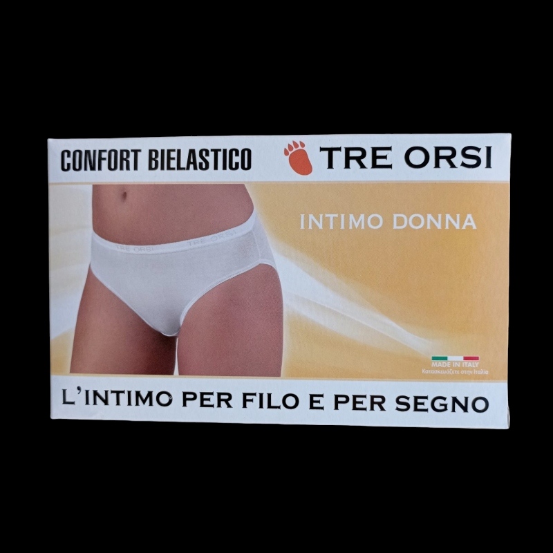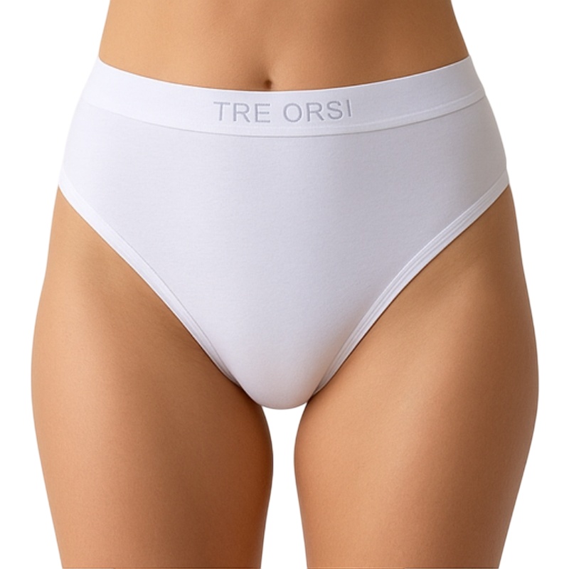 Διαθέτει ελαστική μέση με το λογότυπο TRE ORSI, προσφέροντας σταθερότητα χωρίς να πιέζει. Το κλασικό κόψιμο bikini προσφέρει διακριτική κάλυψη και αναδεικνύει τη σιλουέτα χωρίς να διαγράφει κάτω από τα ρούχα.
