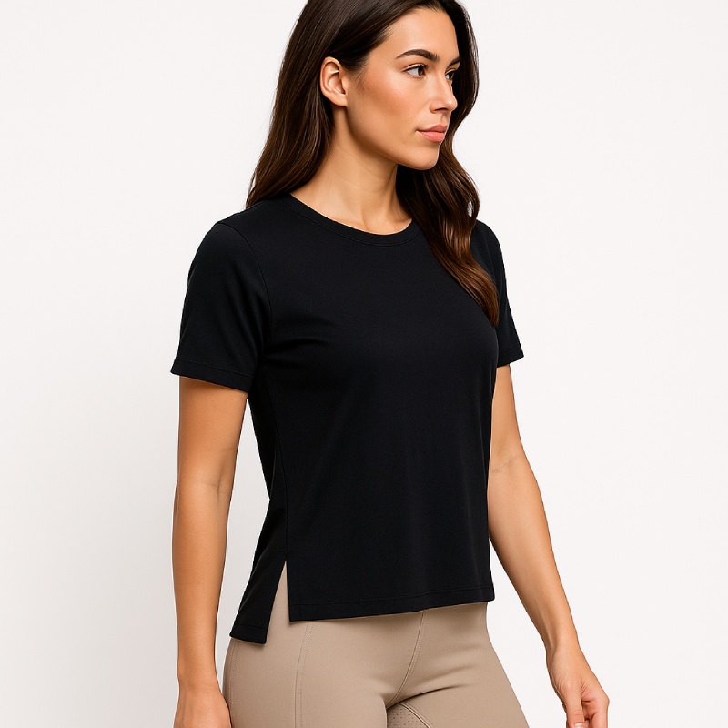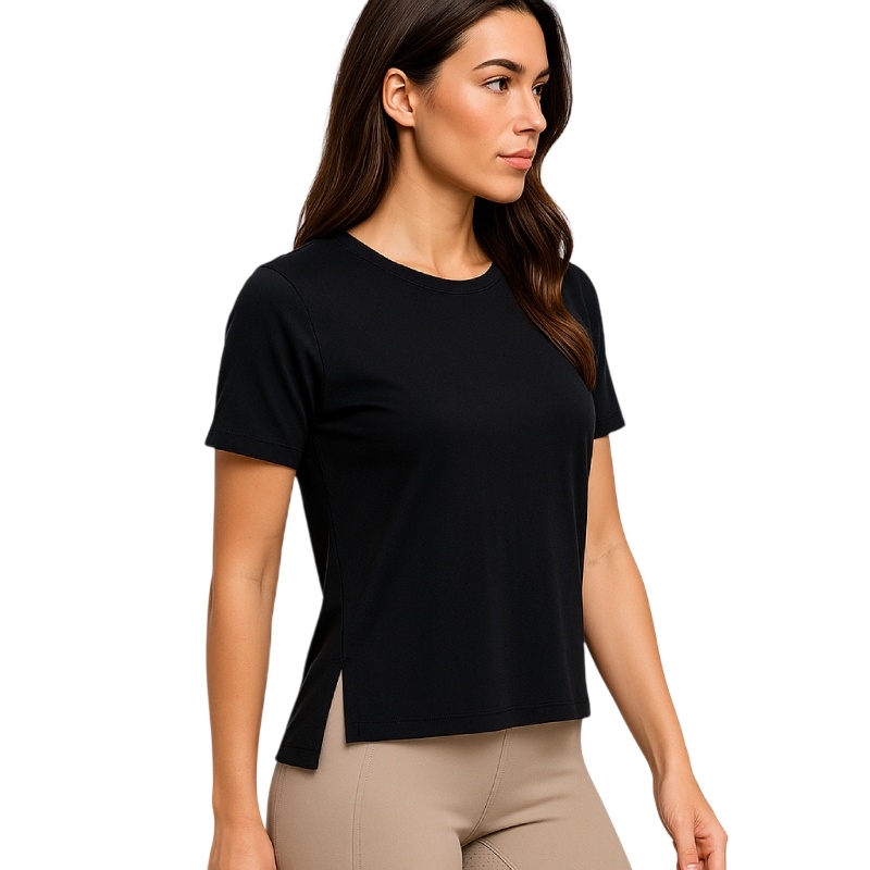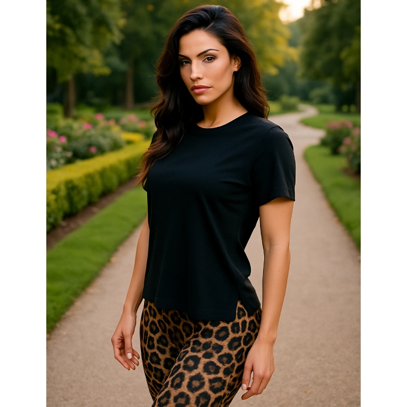 bs collection Γυναικεία Μπλούζα με κοντό μανίκι, σε Μαύρο χρώμα, 67% Tencel 33% Cotton. Το Tencel είναι προϊόν επεξεργασίας ξύλου, έχει παντελή απουσία χημικών, και διαχειρίζεται άριστα την υγρασία του σώματος.