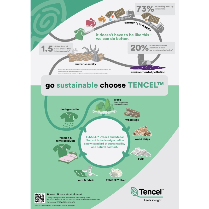 Οι ίνες TENCEL™ Lyocell και Modal μεταμορφώνουν τα υφάσματα για να καλύψουν τις καθημερινές ανάγκες των καταναλωτών. Προερχόμενες από την αειφόρο πηγή ανανεώσιμων πρώτων υλών ξύλο, και παράγονται με περιβαλλοντικά υπεύθυνες διαδικασίες, οι κυτταρινικές ίνες με την επωνυμία TENCEL™ ορίζουν ένα νέο πρότυπο βιωσιμότητας και φυσικής άνεσης.